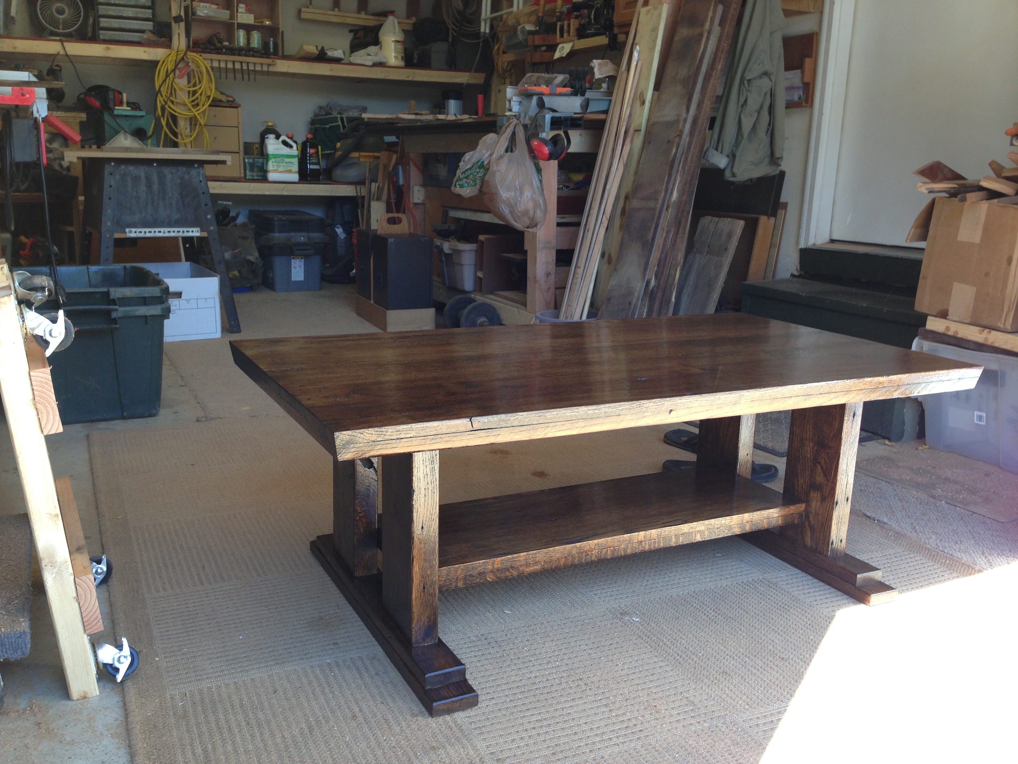 Reclaimed 100 year old oak with trestle style legs, a matching lower shelf and rough-sawn beam lumber legs provide a rustic feel with a Jacobean and Tung oil finish.