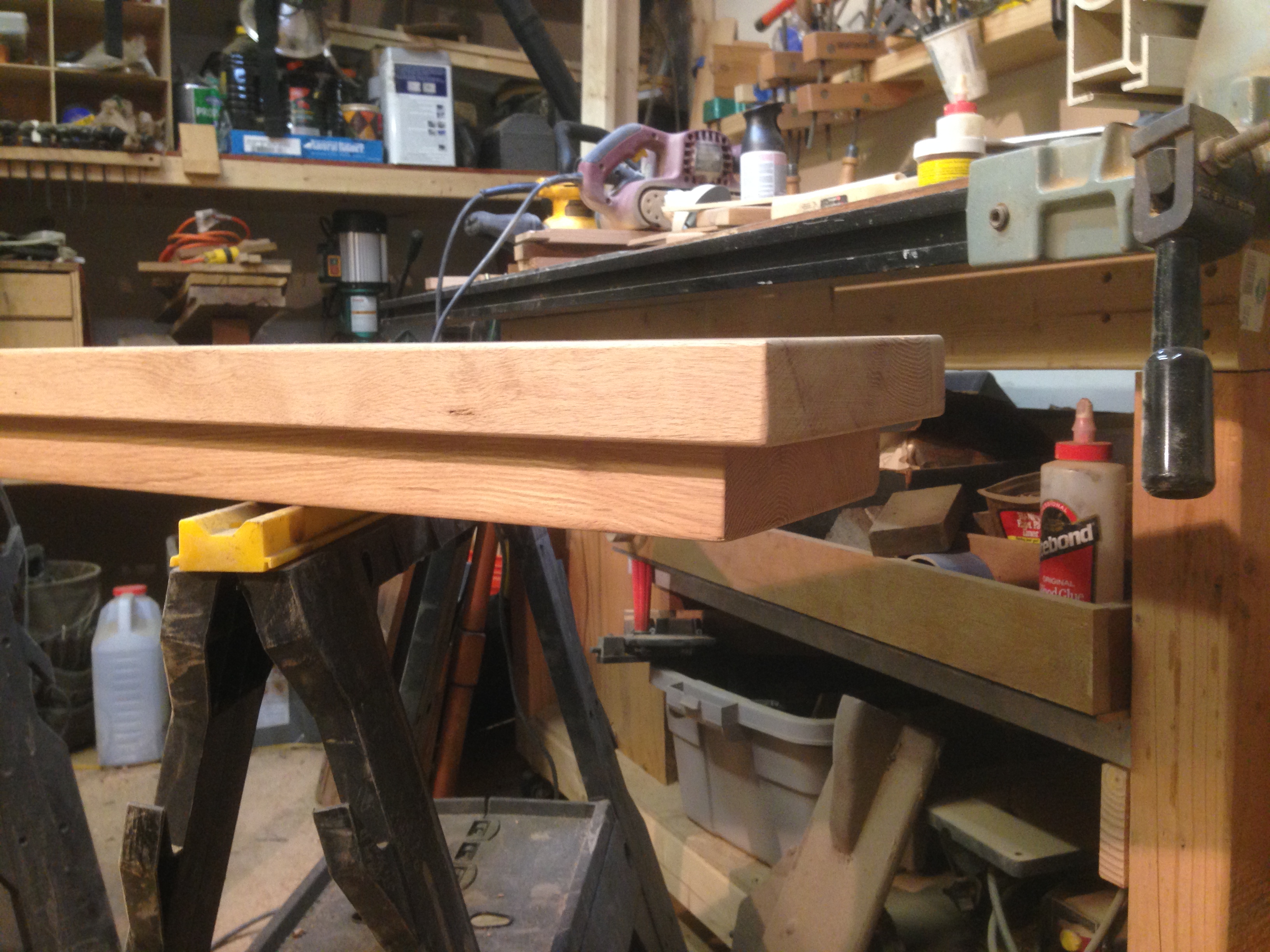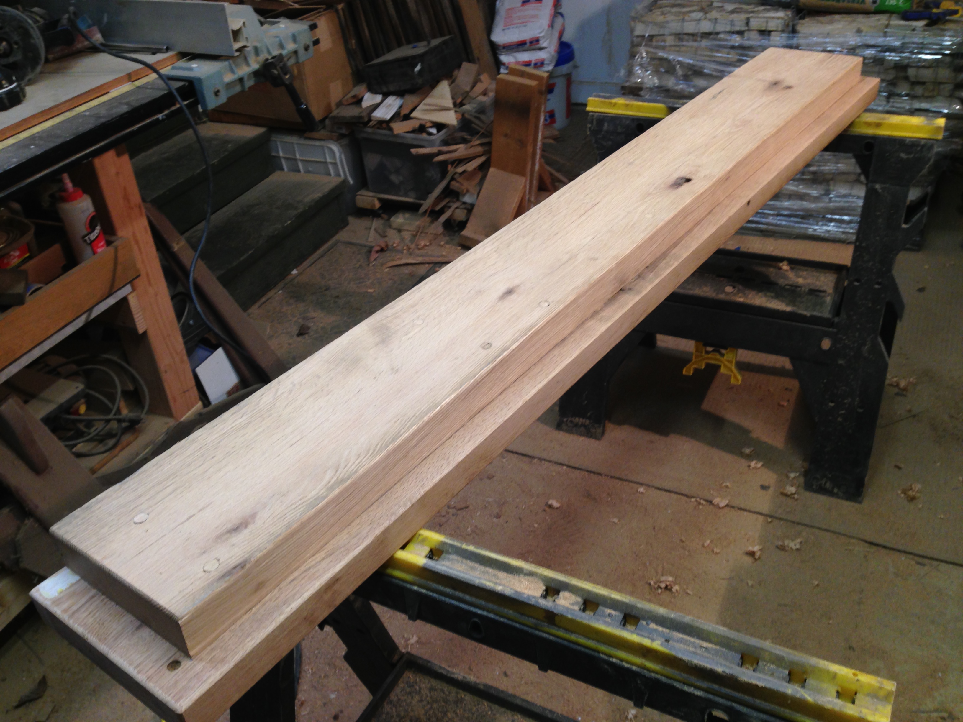 The design was a simple Craftsman Style mantle using two layers of 2x oak with the top overhanging the bottom by 1 1/2″ on all sides. The two piece are planed flat and glued together, then reinforced with countersunk screws. Countersinks were then plugged and sanded flat. In order to maximize the width of the mantle, I offset the top piece by 1 1/2″ and added a filler strip at the back of the top piece equal to the overhang in the front. A 1/4″ roundover router bit was used to relieve the edges