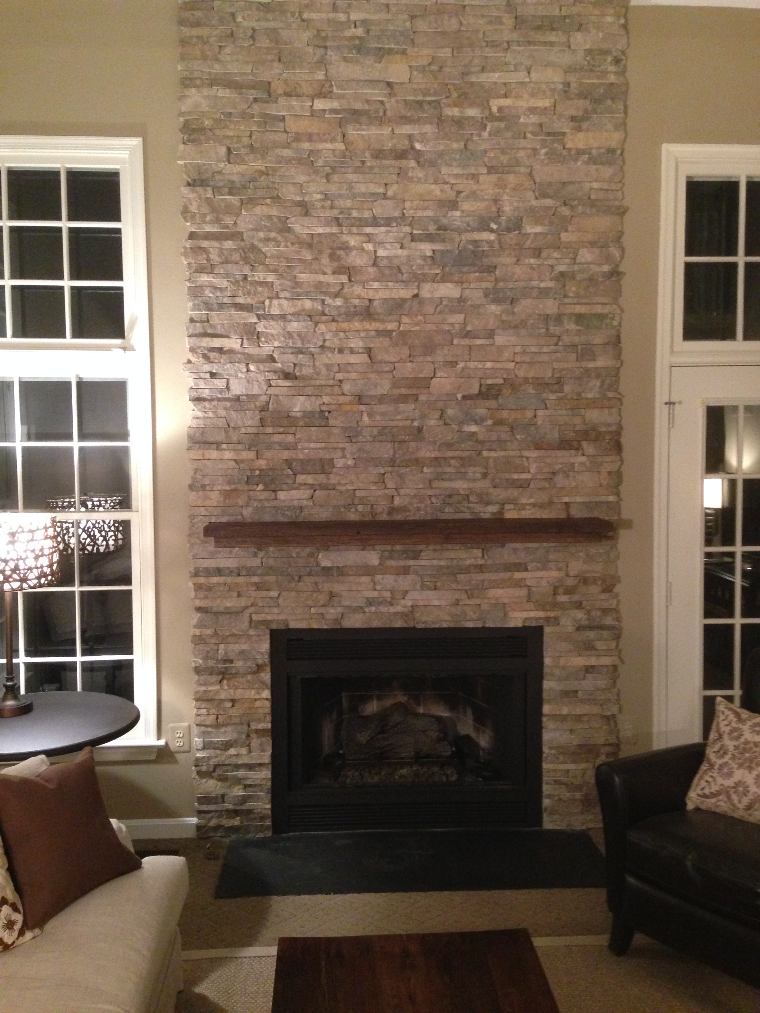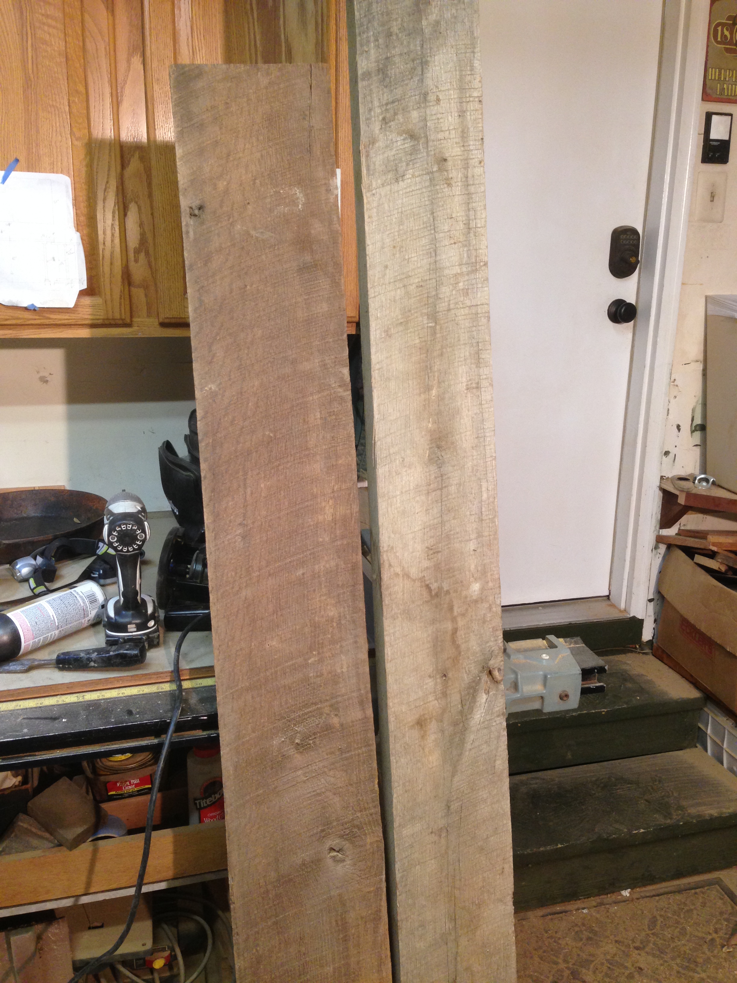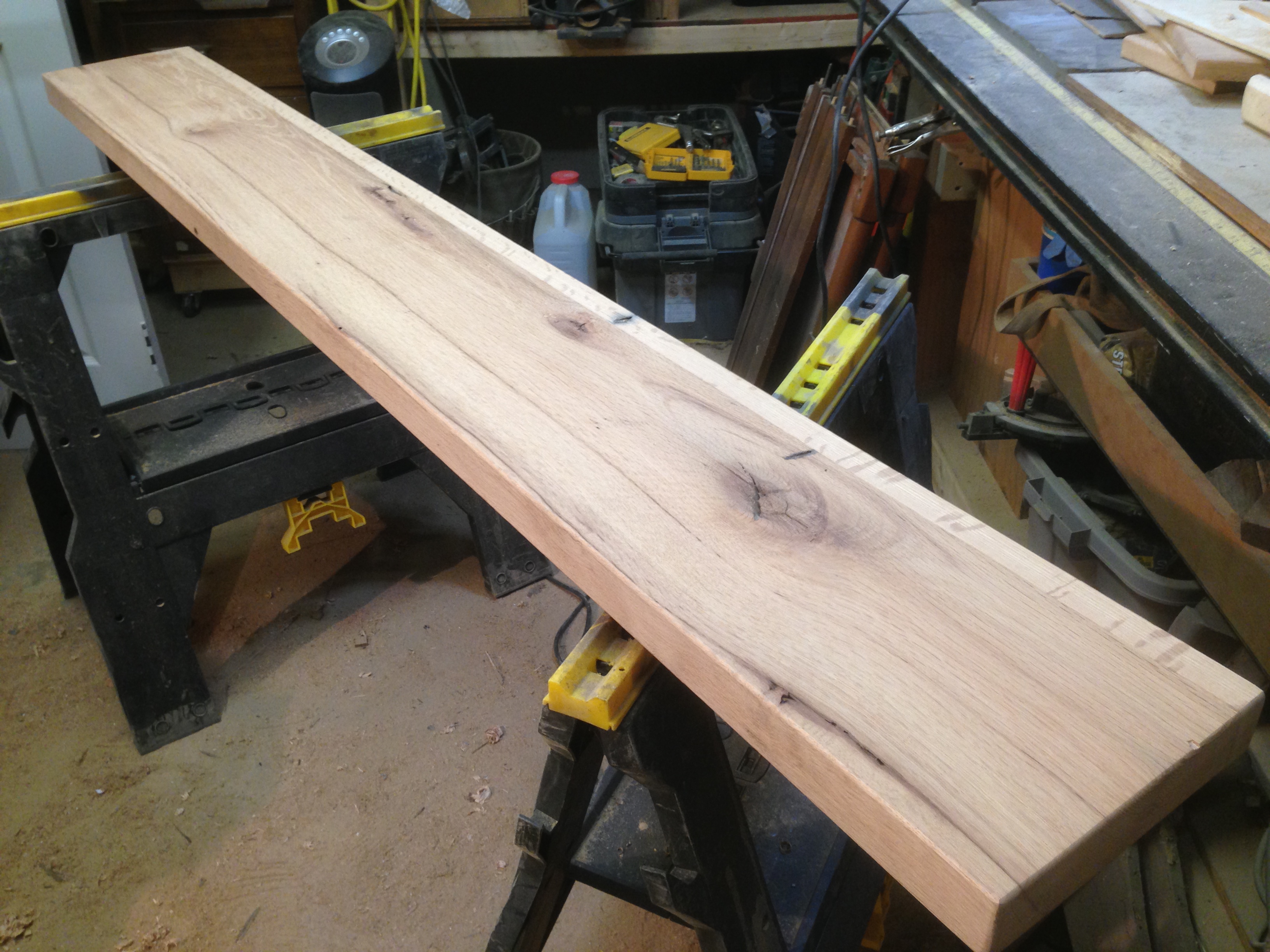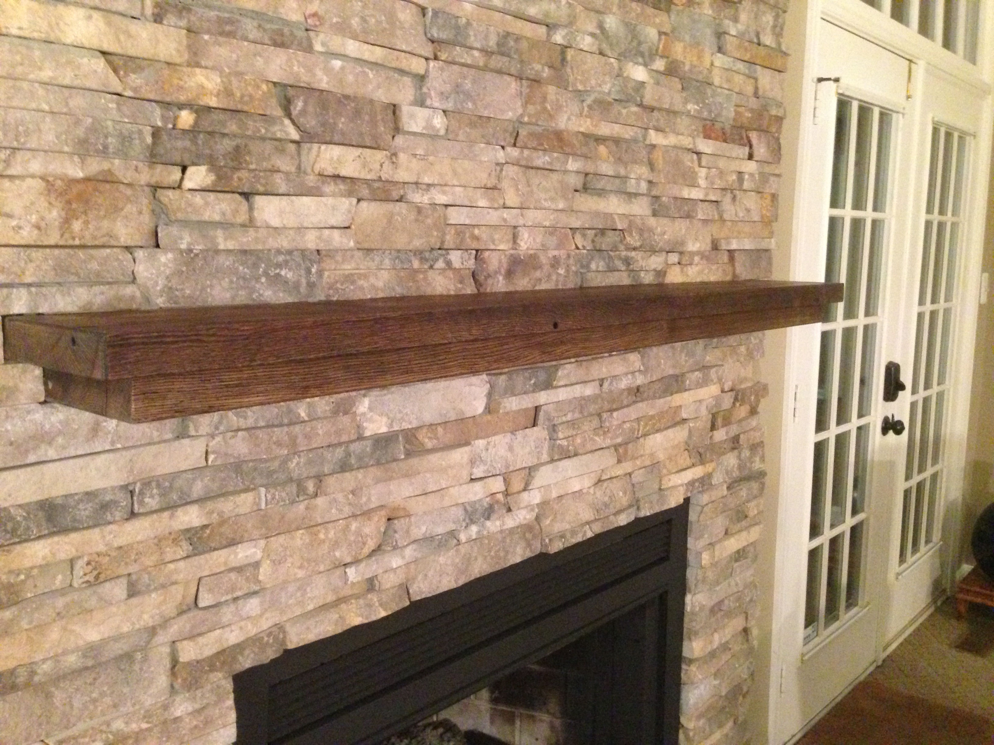 As part of our continued house update project, we decided to have the original fireplace mantle removed and to add a stacked stone wall and new mantle. I wanted to continue the rustic theme that we have been following and decided to select a couple of pieces of 2×8 oak from my reclaimed barn wood stock and build my own replacement mantle.