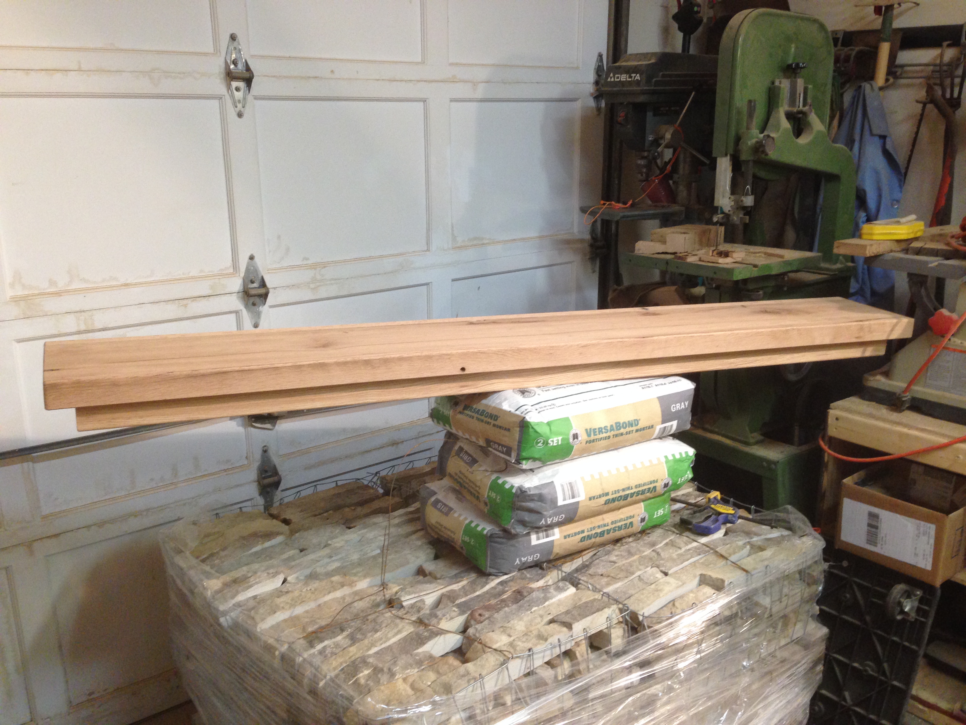 First, I determined the length and height of the mantle. The height was 55″, consistent with the previous mantle and generally the proper height above the top of the fireplace opening. My stacked stone wall was determined to be 76″ in width, so I wanted to size the mantle proportionally for the wall. I determined that the top piece of the mantle would be 66″ and the lower piece would be 63″.