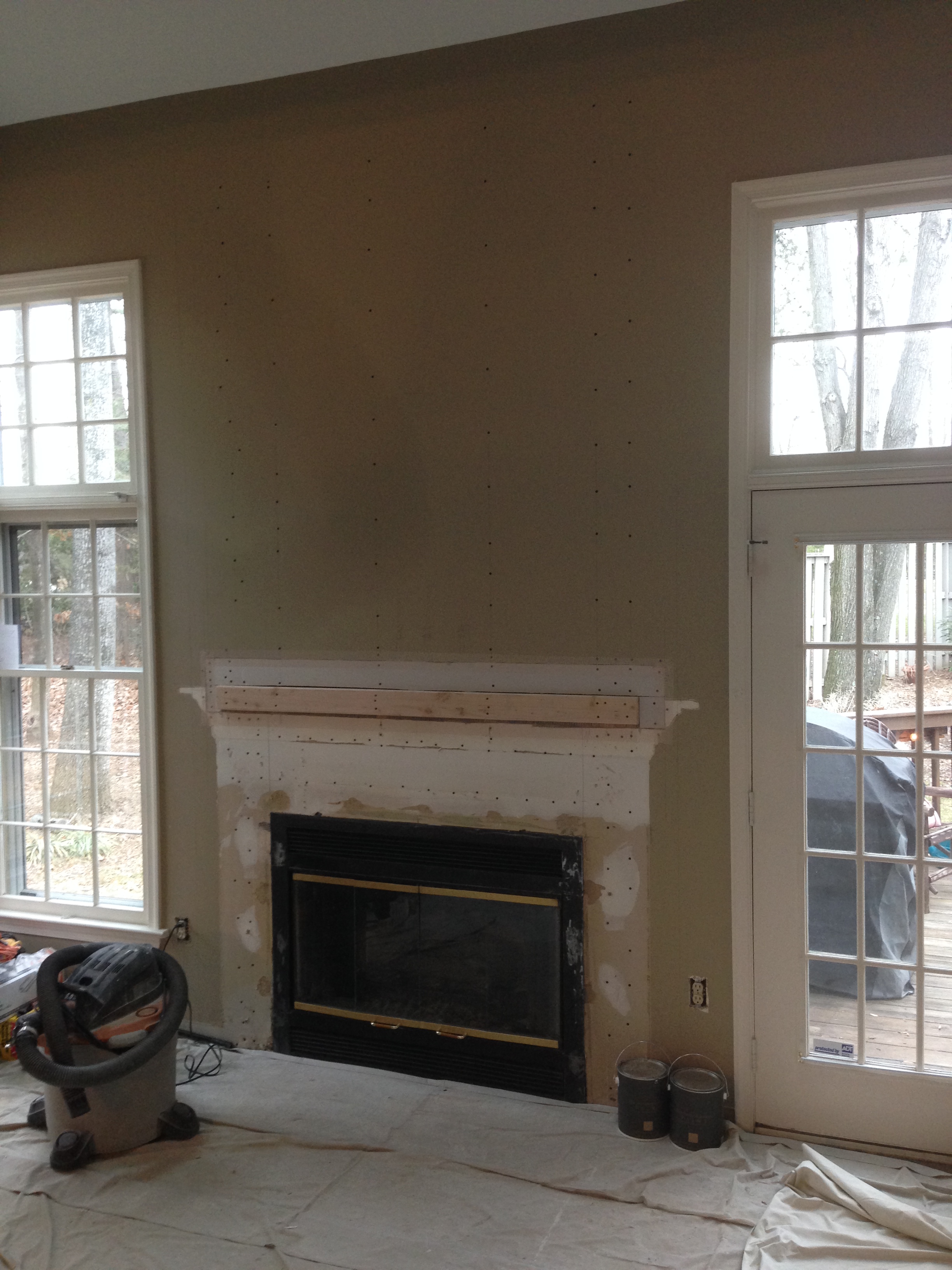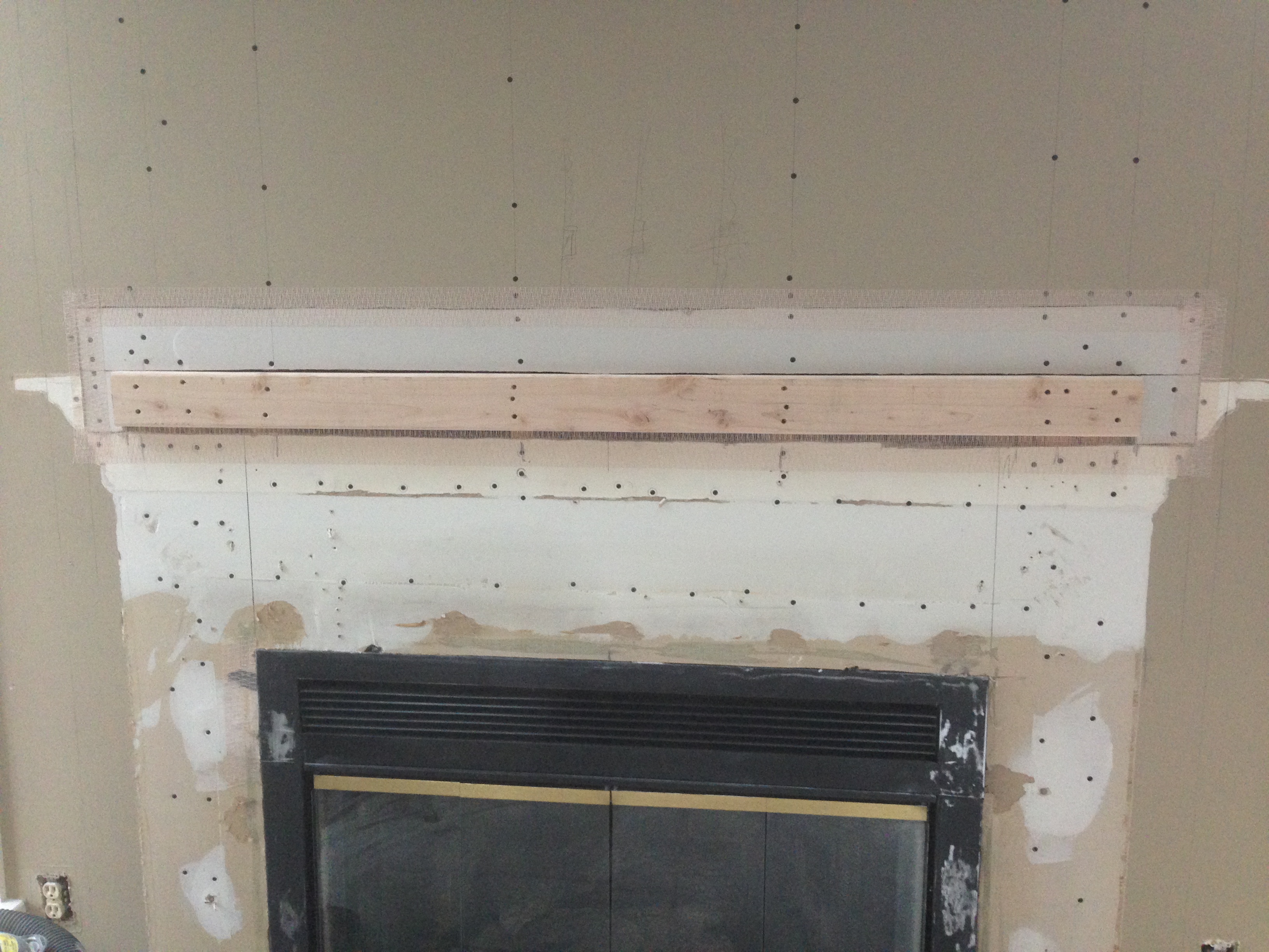With those dimensions in mind, I continued to prep the mantle wall and attach a 2×4 cut to the length of the mantle. The 2×4 was attached directly to the wall studs, by first removing the drywall and then securely attaching at every wall stud with 4″ drywall screws. The 2×4 is only slightly recessed from the eventual stone depth and will be the mounting surface for the mantle.