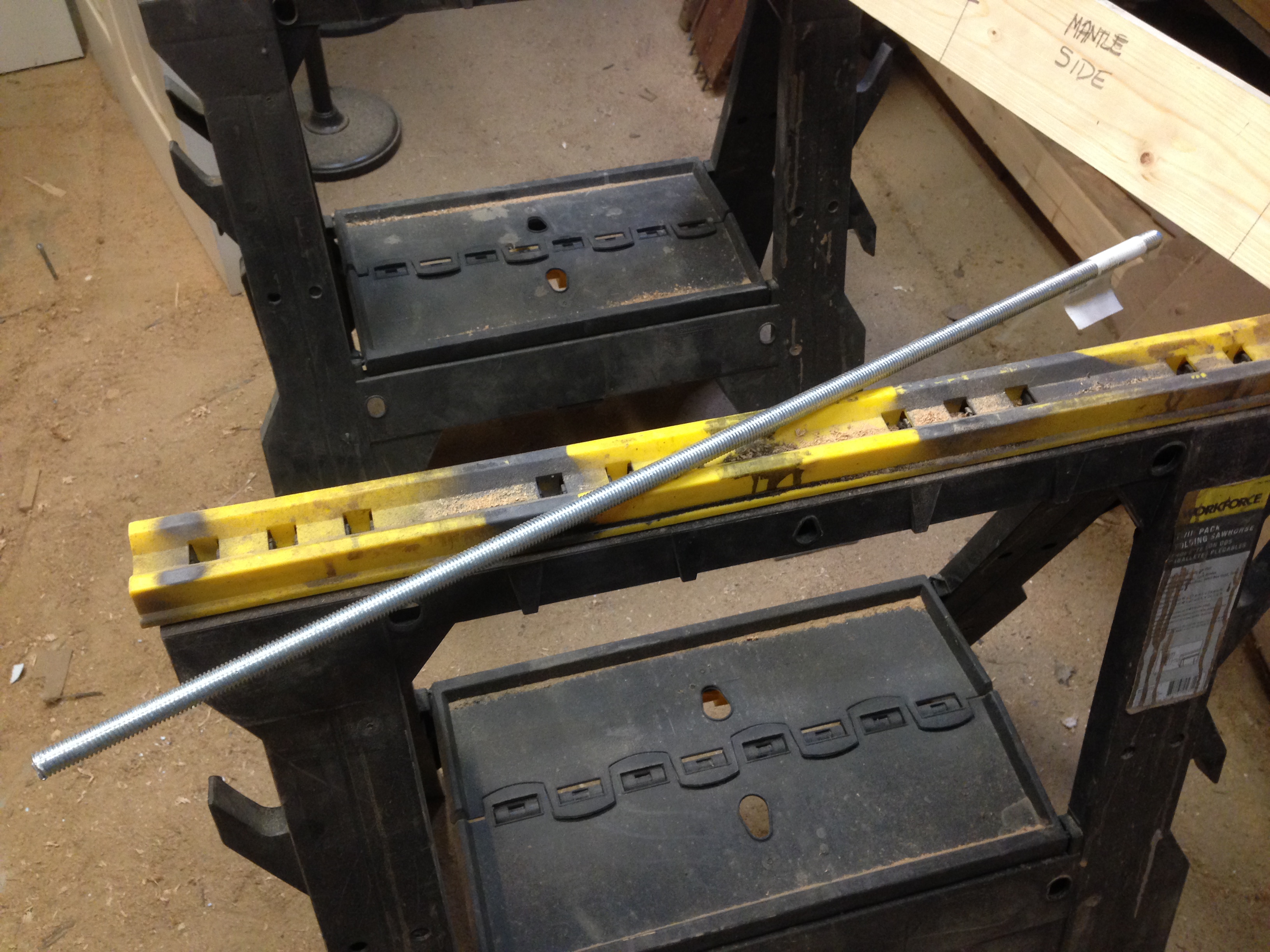 8) Once the holes are drilled, insert the threaded rods into the mantle, in my case 5 total rods. If they are loose fitting, carpenters glue or liquid nails can be used.