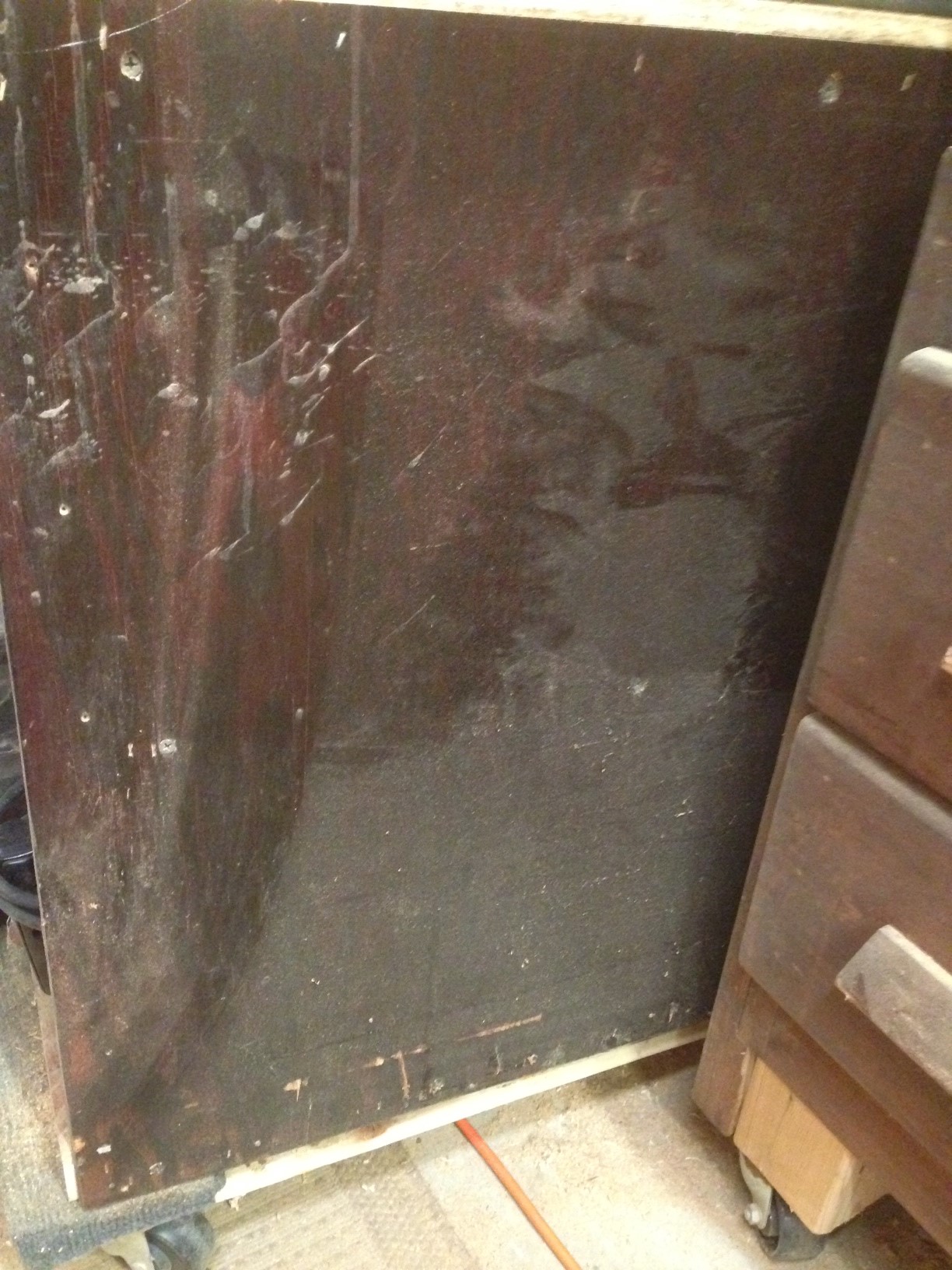 When I took possession of the file cabinet, the front drawers had been sanded to bare wood to reveal their true potential, but the sides, top and back had been covered with what appears to be b-grade 1/4″ plywood that was stained a dark cherry color that more closely resembled cordovan shoe polish.