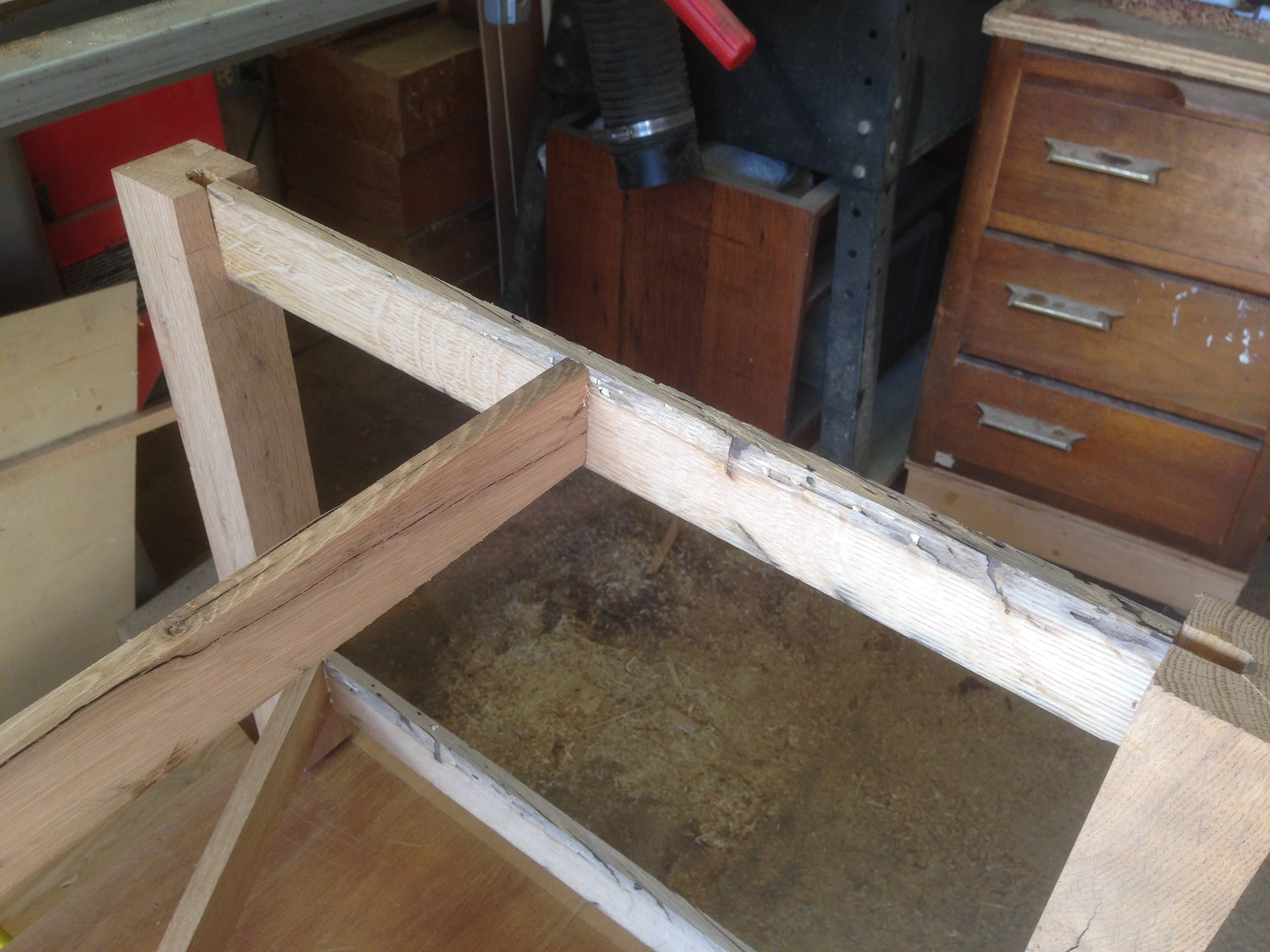 A final stain and finish still needs to be selected, in this case probably something dark to pull the pieces together and enhance the aged look of the wood.