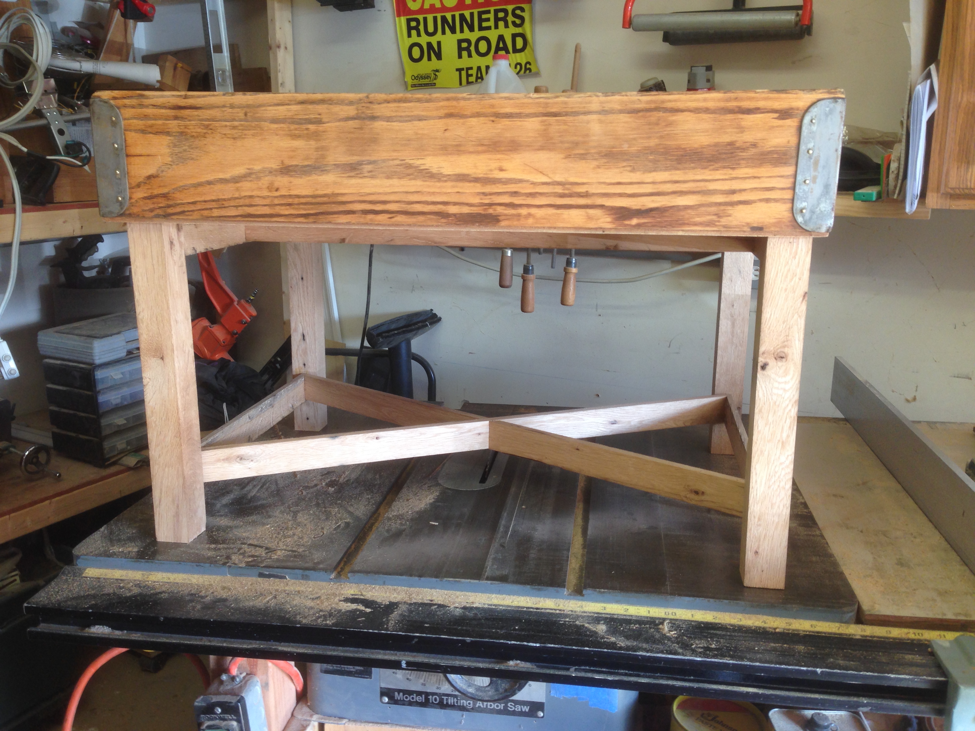 I went to my stack of ancient white oak and selected a well-worn 2×8” from which I could extract four legs, some stretchers and cross-braces. I knew that the character of the lumber and its affinity to accept stain would be unique so I really wanted to cut all of the pieces from a single board. This 2×8 piece clearly had it’s share of weather and insects and that made it all the better, even if it was twisted and so hard that I thought it was nearly petrified.