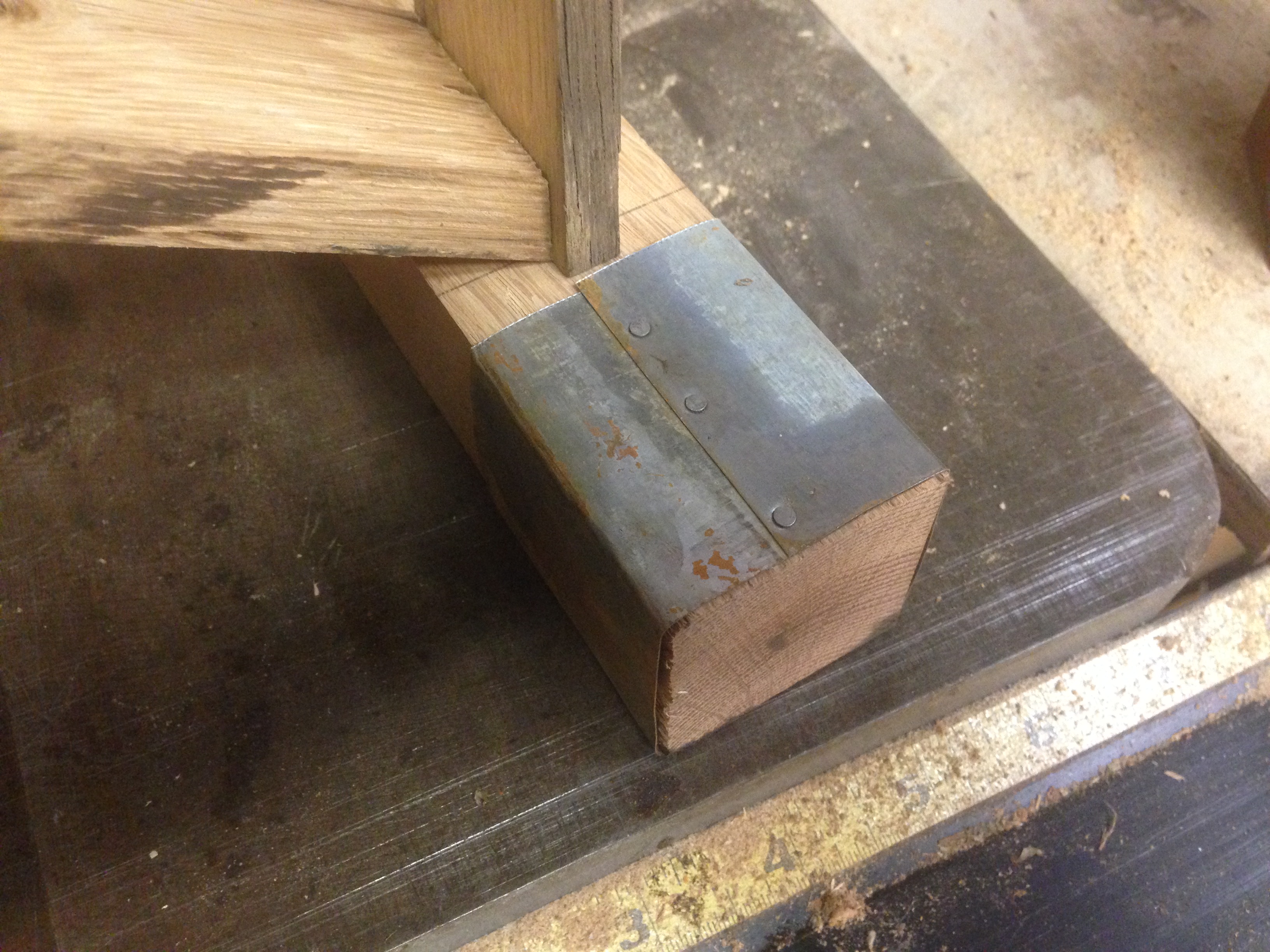 With the basic construction complete, it was time for a few final design enhancements. The original bread tray has reinforced corners of either tin or galvanized metal. I wanted to pull some of those characteristics into the table base. So I decided to add wraps to the bottom of each leg and decorative metal plates to the intersection of the braces. I knew that getting the metal to match to original bread box was as important as the features themselves, so I took a little excursion to the internet to learn how to age galvanized metal.