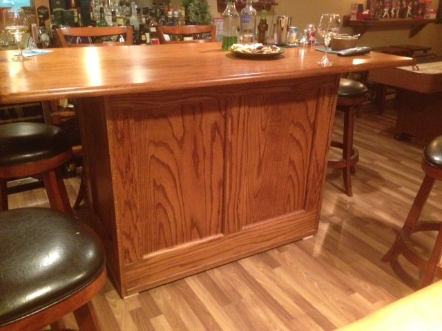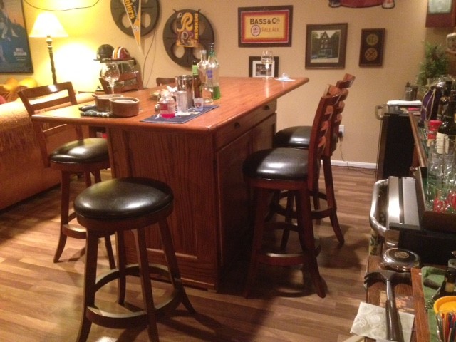 In my case I chose a 4-sided bar so that I could sit folks on all sides. The top is from an old executive’s desk that I purchased for a couple of bucks. I also put mine on wheels so I could move it if desired, perhaps into the corner to facilitate a more traditional bar deployment. As expected, I never have moved it.